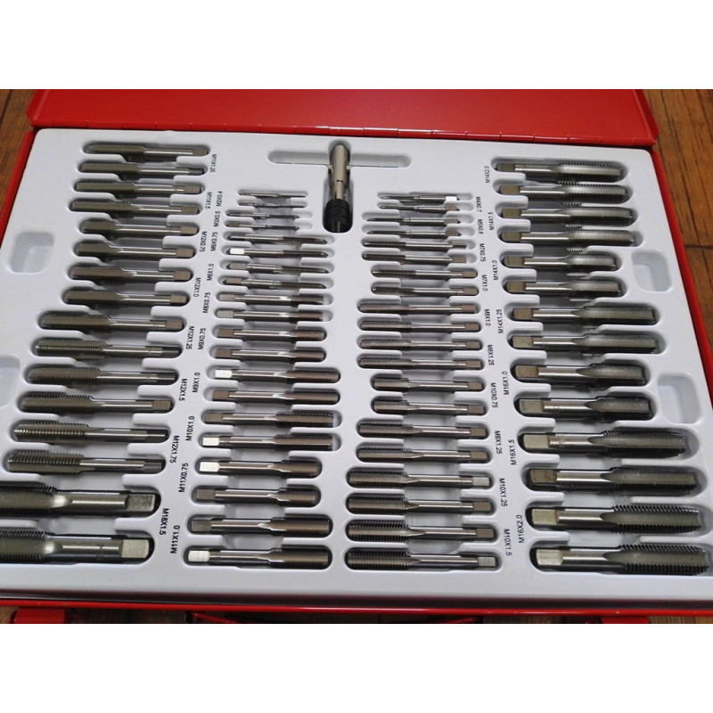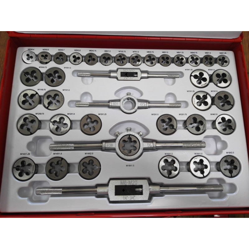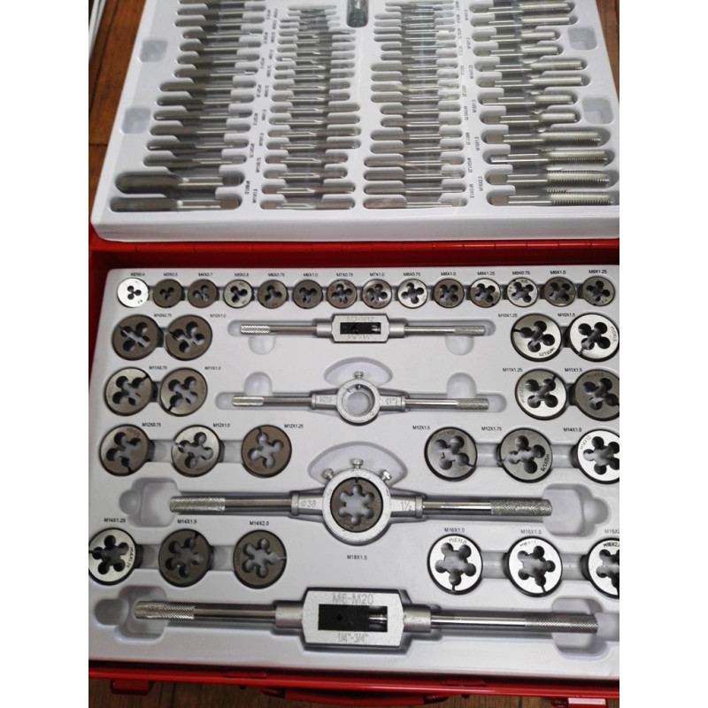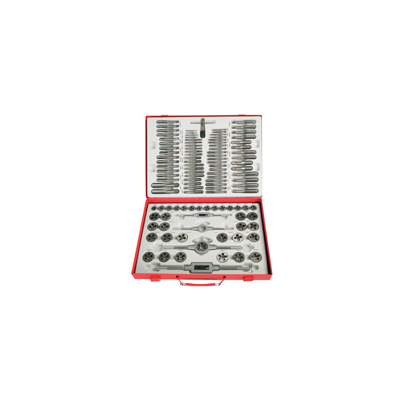 110 Piezas. Juego completo de machos y fileras con giramachos portafileras presentado en caja metálica. Medidas métricas. Capacidad. M2 a M18. Acero tungsteno.