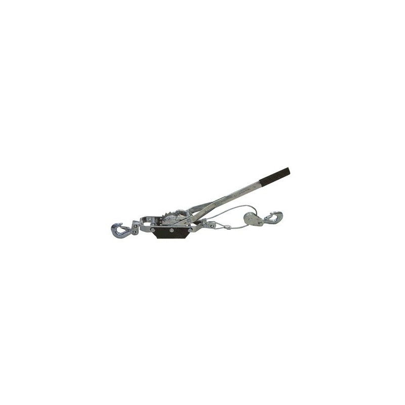 Tensor equipado con cable de acero 2 T. Dispositivo con dos ganchos de seguridad. Trabaja desde todos los ángulos, tanto vertical como horizontal. Ideal para trabajos al exterior, barcos, camiones, etc. Construcción de acero con piñón de doble seguridad. 2 piñones y 2 trinquetes. Ratio de levantamiento: 15:1.