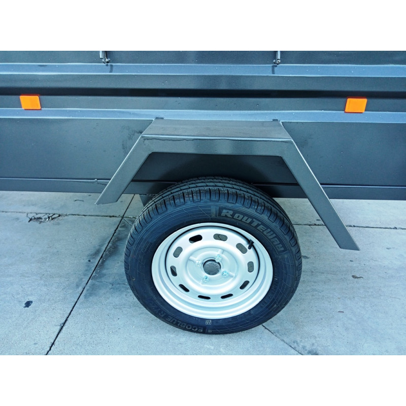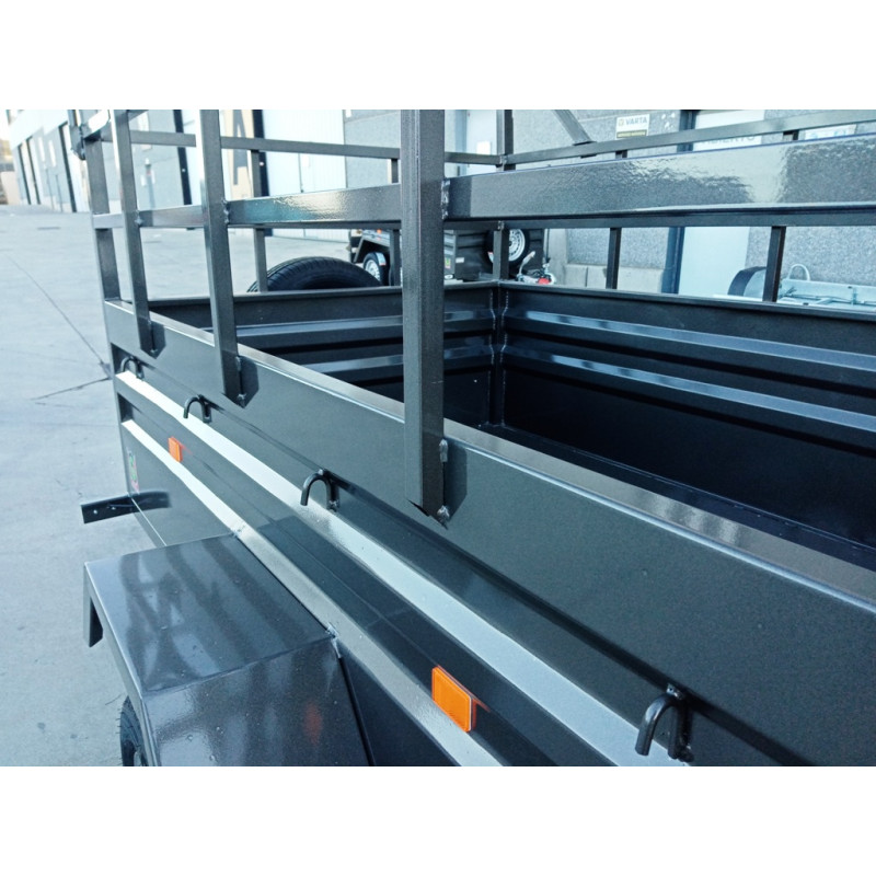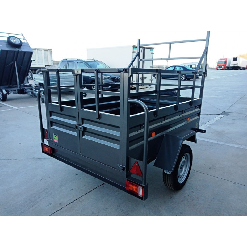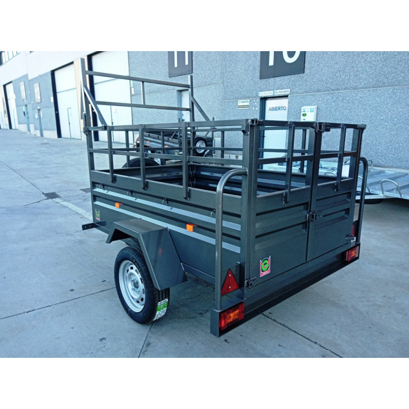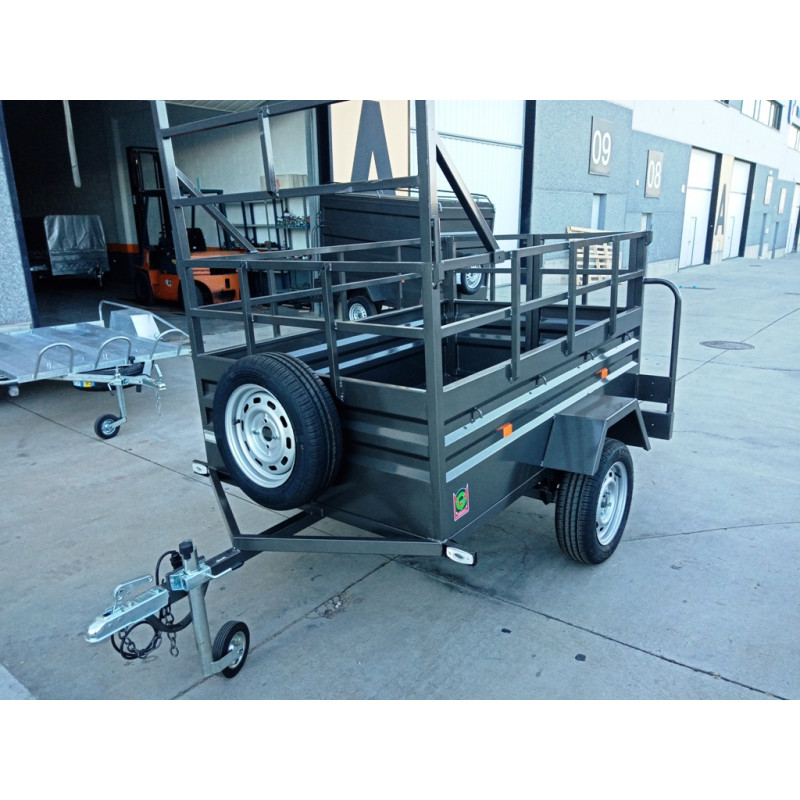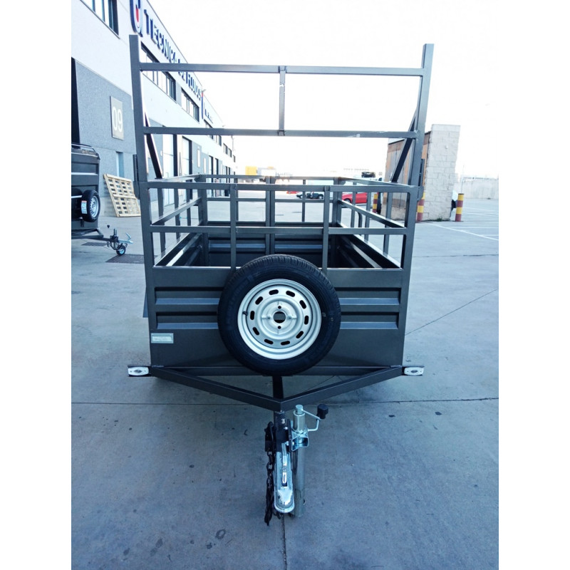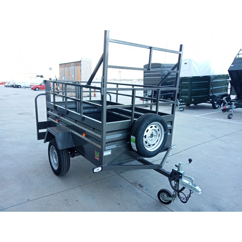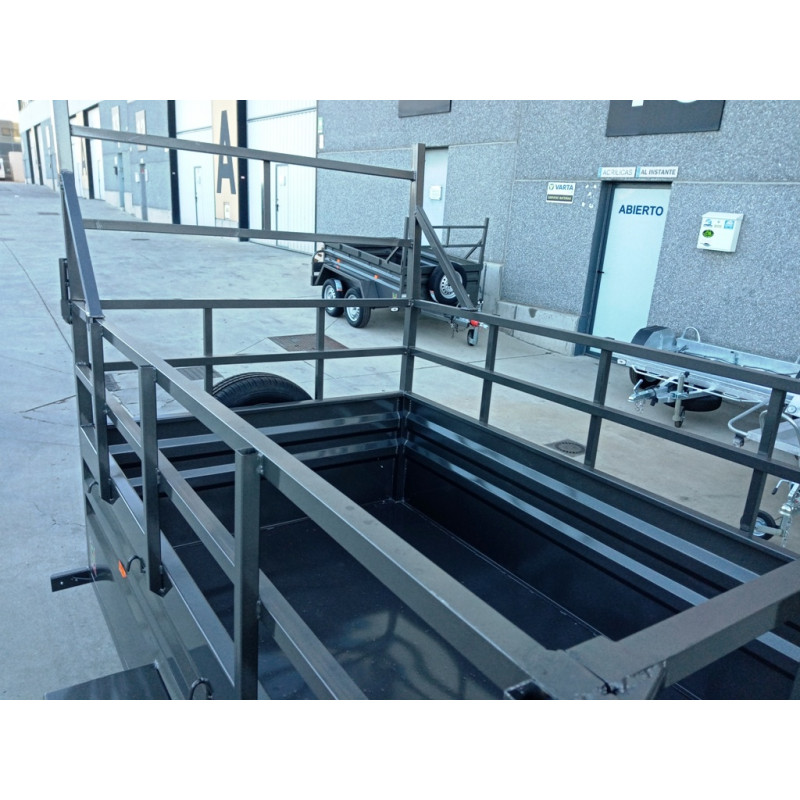 Remolque nuevo de 200 x 130 x 52 cm mas barandilla de 40 cm. Puerta de libro. Un eje de 750 kg con llantas de 13". Incluye rueda de repuesto y rueda jockey de 48 mm Ø. Pescante delantero opcional 60 €. Freno de inercia 325 €.