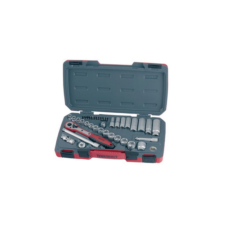 Contiene 14 vasos hexagonales serie regular y 6 vasos hexagonales serie larga, llave de bujías de 16 y 21 mm.llave de carraca de fibra reforzada, articulación universal, alargadera de 150 mm. alargadera angular de 75 mm. adaptador para puntas de 1/2" x 3/8" y 11 puntas destornillador variadas. En caja de plástico con cierre de bloqueo, asa retráctil y bisagras con eje metálico.