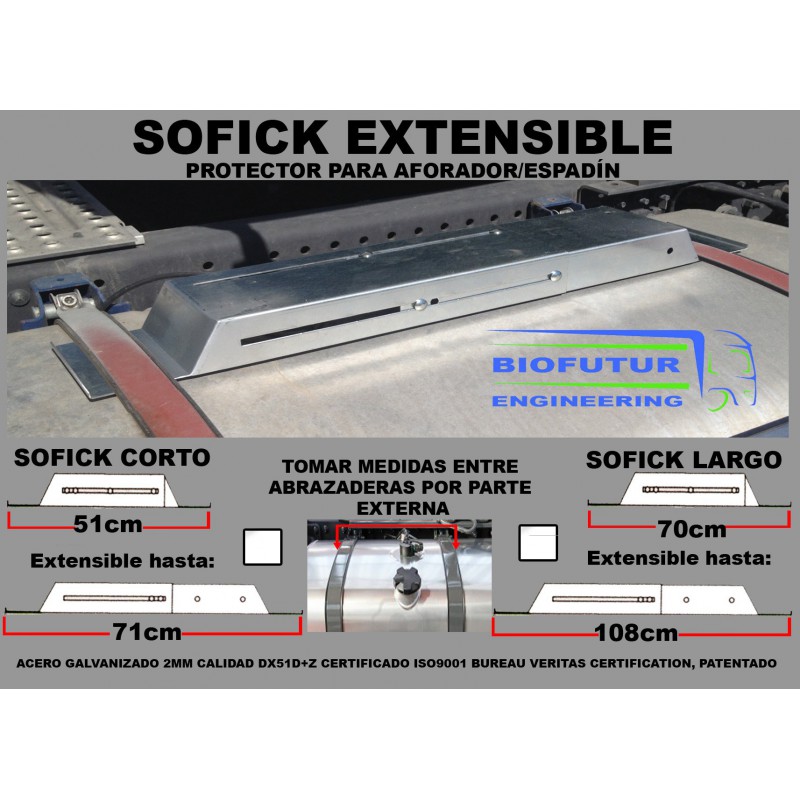 SOFICK protector para el aforador lo trabajamos en acero de calidad DX51 D+Z, o en aluminio especial para la fabricación de tanques. Similar al utilizado en la fabricación de depósitos de combustibles. ¡Verifique su elección al hacer el pedido!