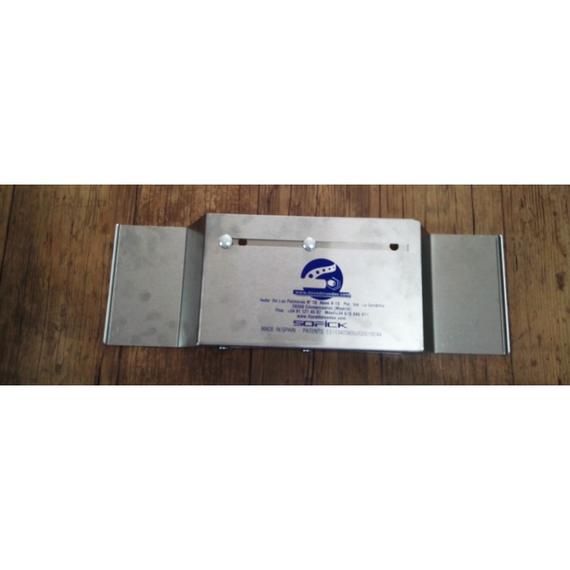 Características: Formado por dos piezas extensibles de aluminio de 2 mm cada una, sujeto a las correas del depósito. Al entrecruzarse los componentes que lo conforman el grosor adquirido aumenta hasta 4 mm en la parte a proteger, proporcionando una gran rigidez y protección.