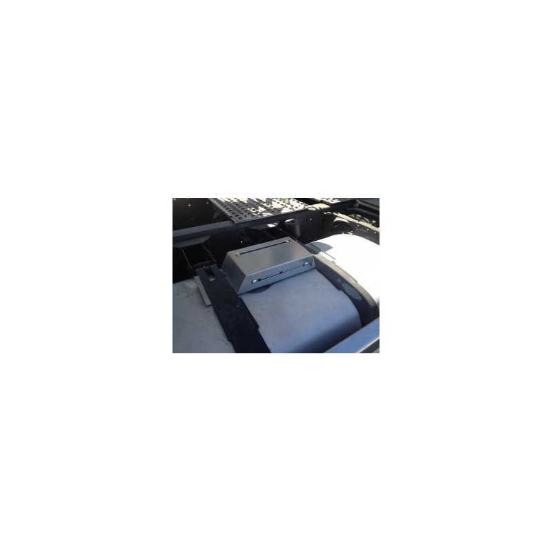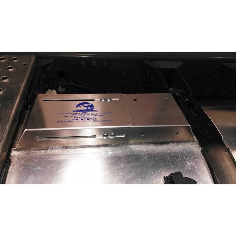 Características: Formado por dos piezas extensibles de aluminio de 2 mm cada una, sujeto a las correas del depósito. Al entrecruzarse los componentes que lo conforman el grosor adquirido aumenta hasta 4 mm en la parte a proteger, proporcionando una gran rigidez y protección.