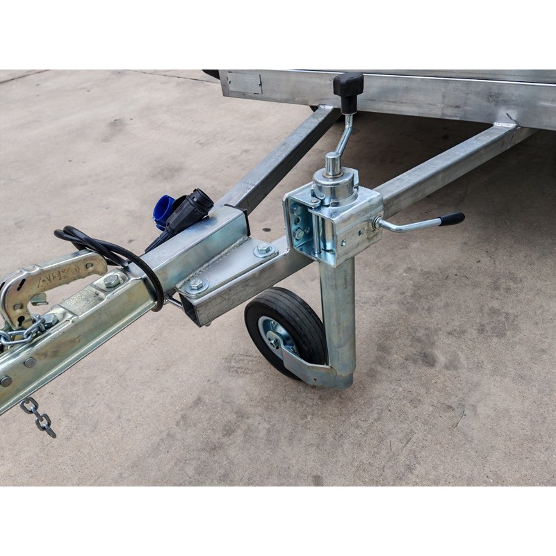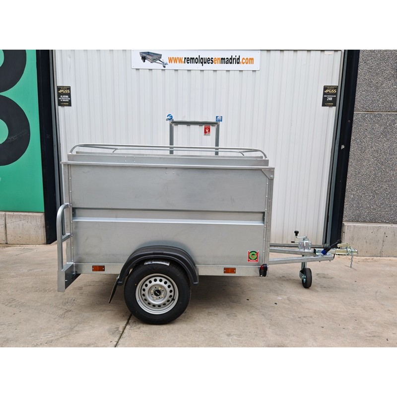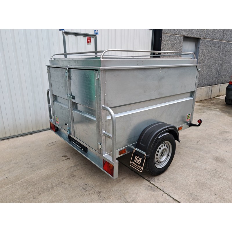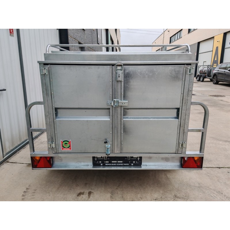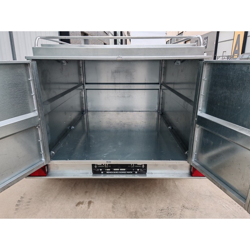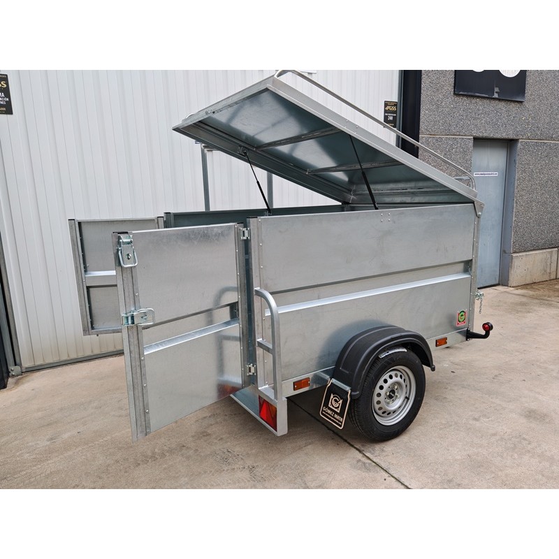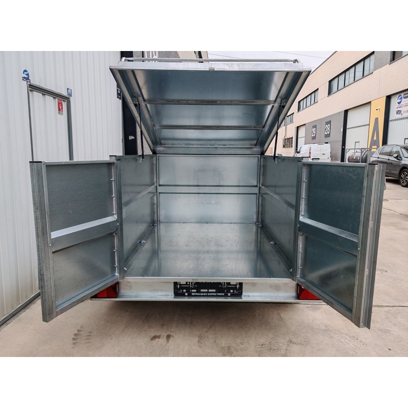 Remolque de caja cerrada homologado a 750 kg y con medidas de la caja 180x138x88 cm + la tapa abatible por resortes de gas y con baca para aumentar el volumen de carga. Lanza en V y rueda jockey de Ø48 mm. Todo entero galvanizado y con las puertas de doble hoja. Pilotos con triángulo incorporado y pilotos de gálibo de goma que absorben pequeños impactos sin dañarlos. Rueda de repuesto opcional + 80 €
