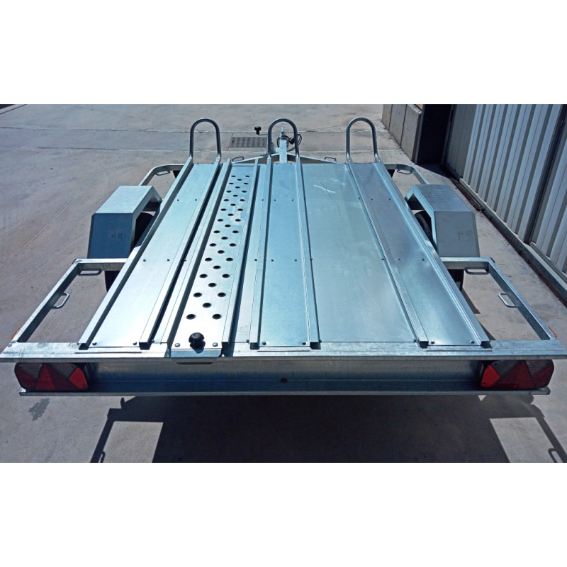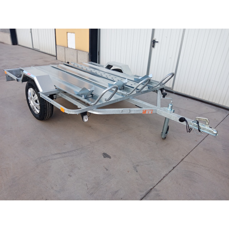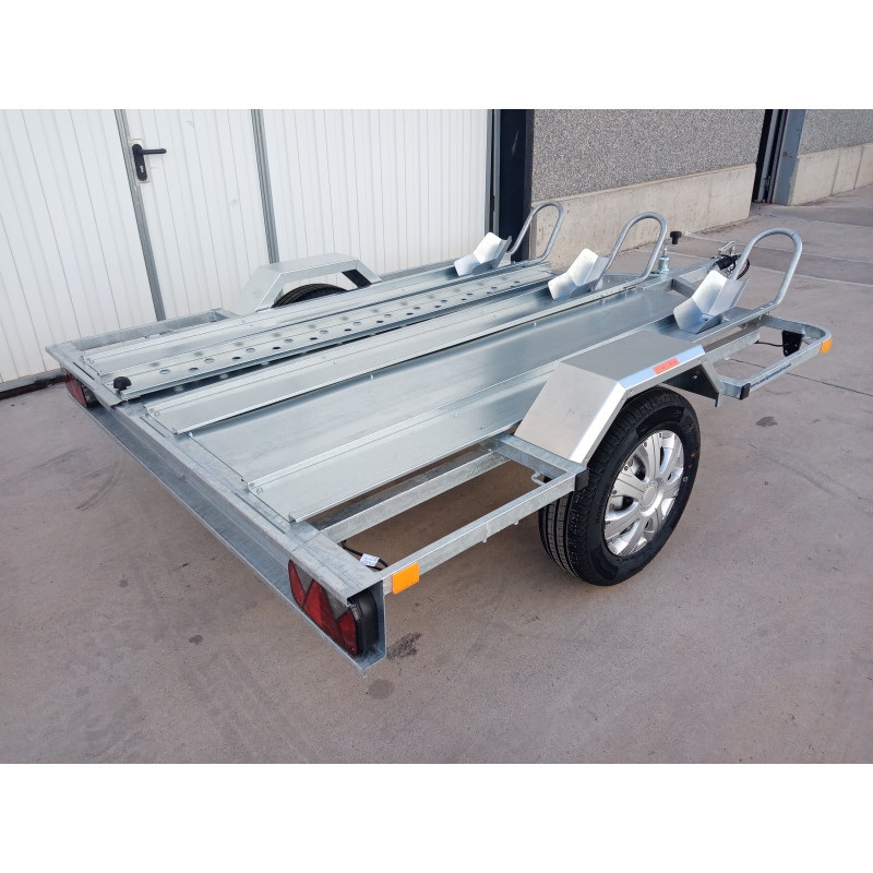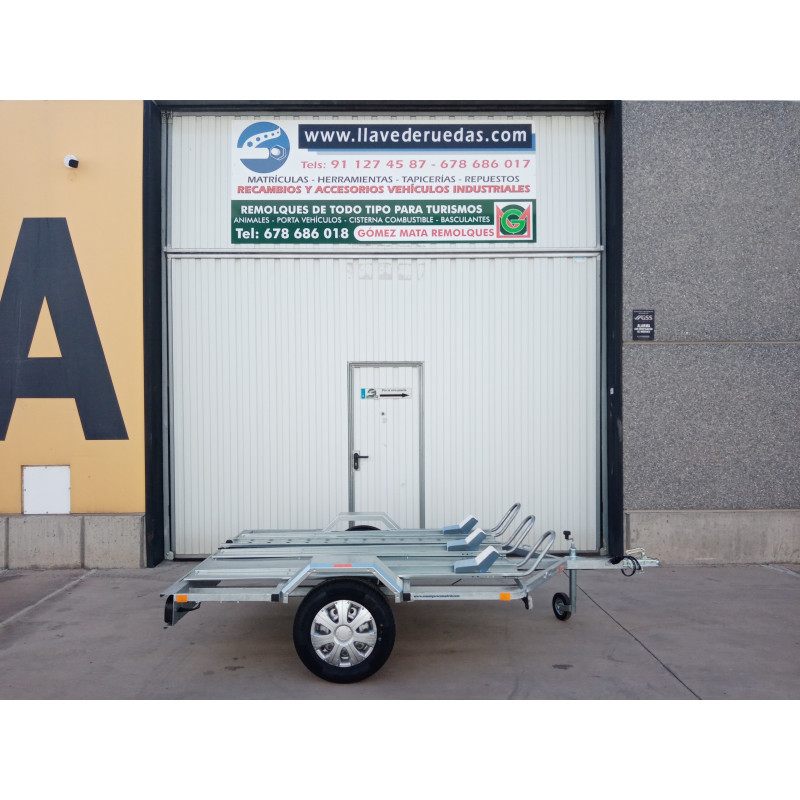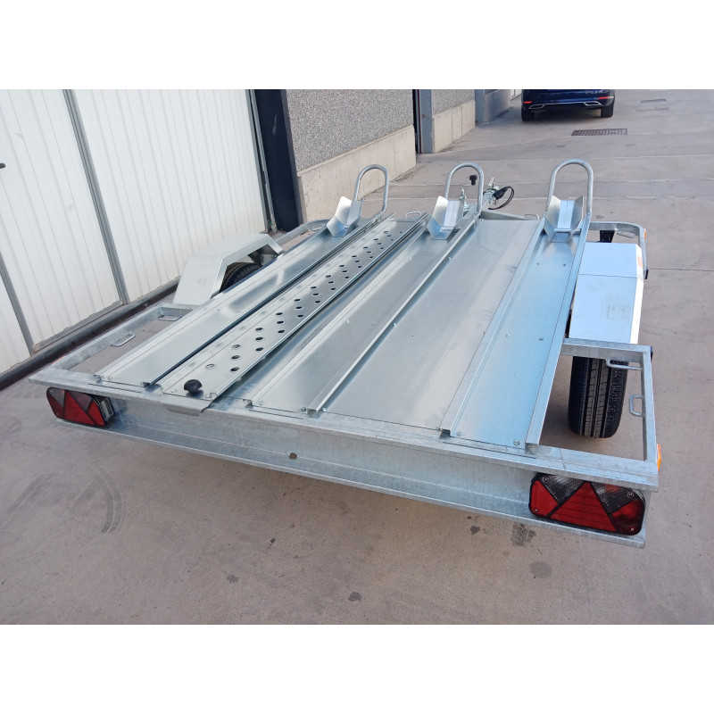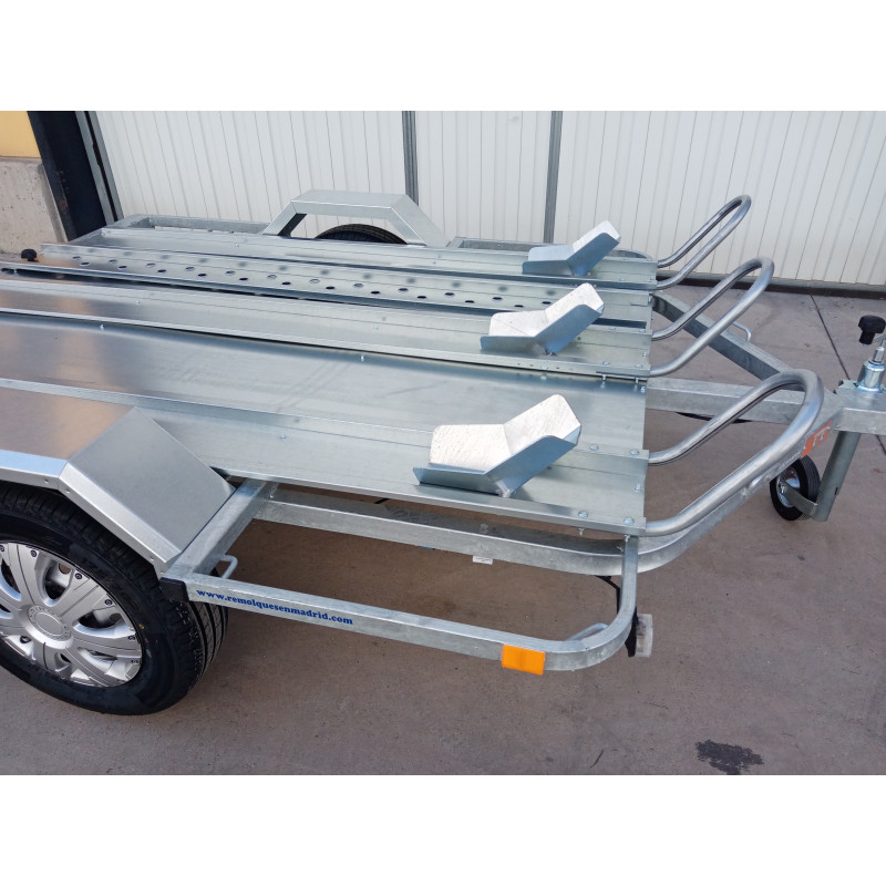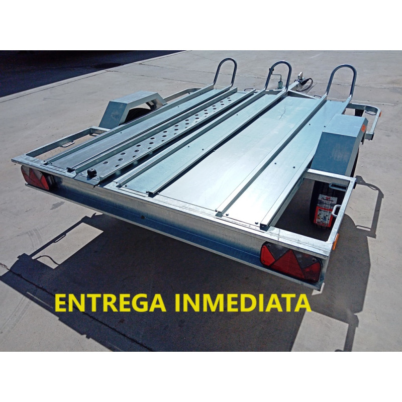 Remolque portamotos con tres carriles y MMA de 750 kg. Neumáticos 175/70 R13", incluye rampa de acceso y rueda jockey. IVA NO INCLUIDO.