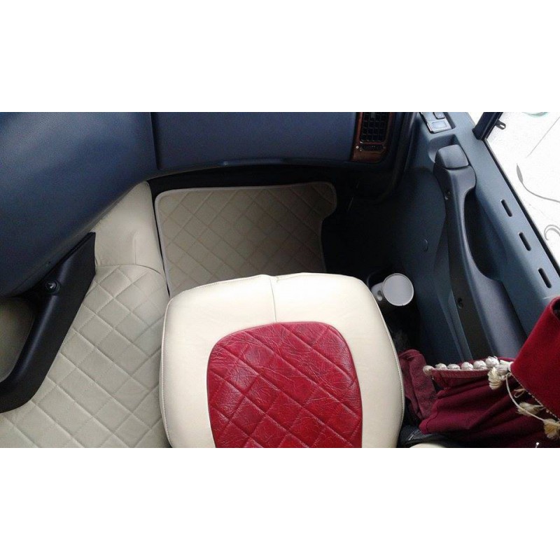 Alfombras en polipiel con acabados de calidad profesional, hechos a la medida de su camión y personalizados con el color que uted elija del muestrario que puede ver en la galería de imagenes de este artículo. Indiquenos en un mensaje la marca, modelo y año de fabricación de su camión y el color elegido. El plazo de entrega de las tapicerias es de dos a cuatro semanas.
